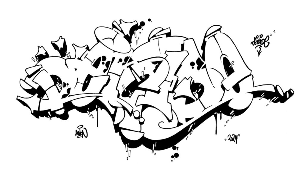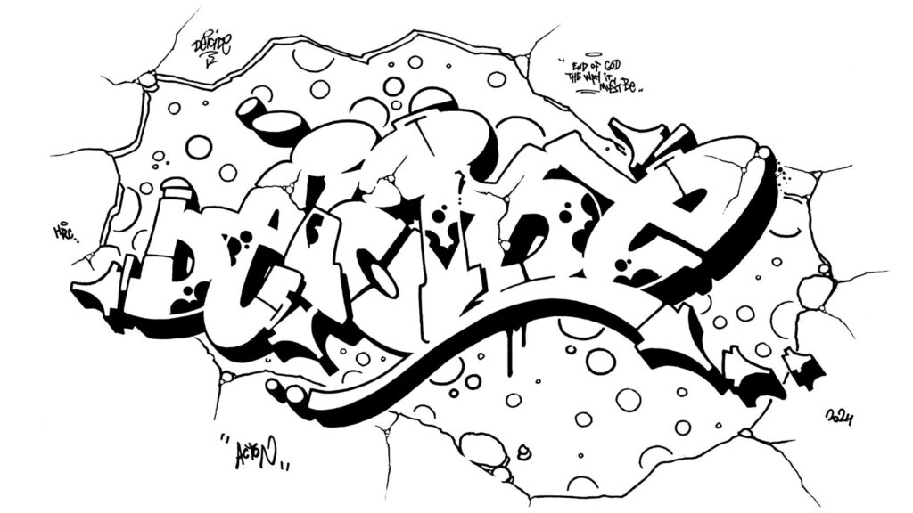 DEICIDE x 4 | pencil & fineliner on paper | spraypaint on a wall | 2024, 2015