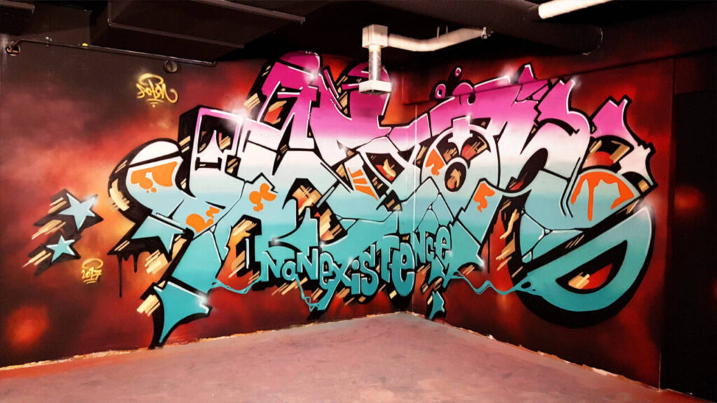As for the piece… In autumn 2017, my crewmate Soved invited me to paint with him at a local bar/venue in Lahti (FI). It turned into a fun project: we spent the whole day and part of the night there, painting while the place was being renovated, listening to music, and chatting away. Since pubs are usually quite dark, I chose relatively bright colors.