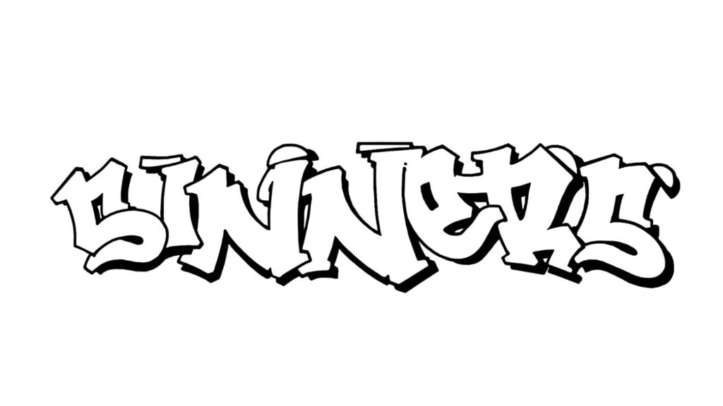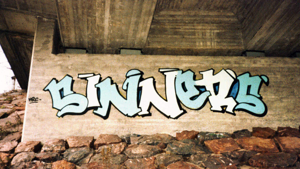 In 1993 I wanted to paint the whole song title, but instead I ended up painting only the first word, Sinners, together with Dams somewhere along the Länsiväylä highway. Plain and simple — focus on just the letters. Two shades of roller paint, one can of black Carosol for the outline, and the last drops of darkish blue for the gaps between the letters — most likely the very same can we had used for the first outlines. A budget piece, since there weren’t even any highlights included, which was really rare for me.